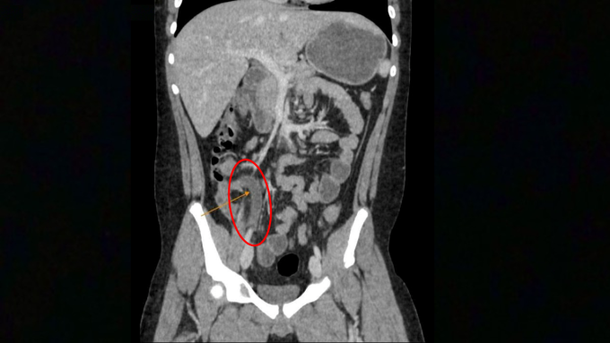 Tại Phòng khám Đa khoa Tâm Anh Quận 7 (TP HCM), kết quả xét nghiệm máu cho thấy các chỉ số viêm nhiễm của Hưng tăng vọt một cách đáng báo động: bạch cầu lên tới 22.74 K/ul (cao hơn gấp đôi mức bình thường dưới 10 K/ul) và chỉ số CRP tăng gấp 4 lần, cho thấy tình trạng viêm nhiễm cấp tính nghiêm trọng. Hình ảnh chụp CT-Scan sau đó hé lộ nguyên nhân thực sự: ruột thừa của Hưng có đường kính 12 mm (vượt xa mức 6 mm báo hiệu viêm) và bị bít tắc bởi một sỏi phân kích thước 8 mm. Chính viên sỏi này đã làm tăng áp lực bên trong ruột thừa, chèn ép mạch máu, dẫn đến tình trạng viêm hoại tử và vỡ ruột thừa chỉ trong thời gian ngắn, đòi hỏi phải phẫu thuật cấp cứu khẩn cấp.