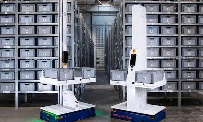 Robot Brightpick, với thiết kế hiện đại, được thấy đứng giữa các giá đỡ kim loại chứa đầy thùng hàng trong một cơ sở, sẵn sàng thực hiện nhiệm vụ.